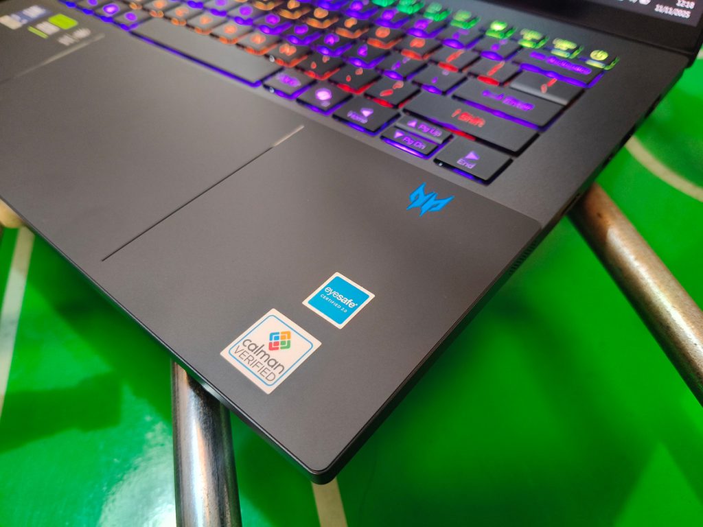 Salah satu hal paling menakjubkan dari Predator Triton 14 AI adalah layarnya. Acer menanamkan layar OLED WQXGA+ (2880 x 1800) dengan refresh rate 120 Hz, response time 1 ms, serta cakupan warna hingga 100% DCI-P3. Bukan hanya cepat, tapi juga indah. Panel ini telah tersertifikasi oleh Calman, menjamin akurasi warna tingkat profesional. Artinya, setiap warna, bayangan, dan efek cahaya ditampilkan sebagaimana mestinya. Benar-benar real.
