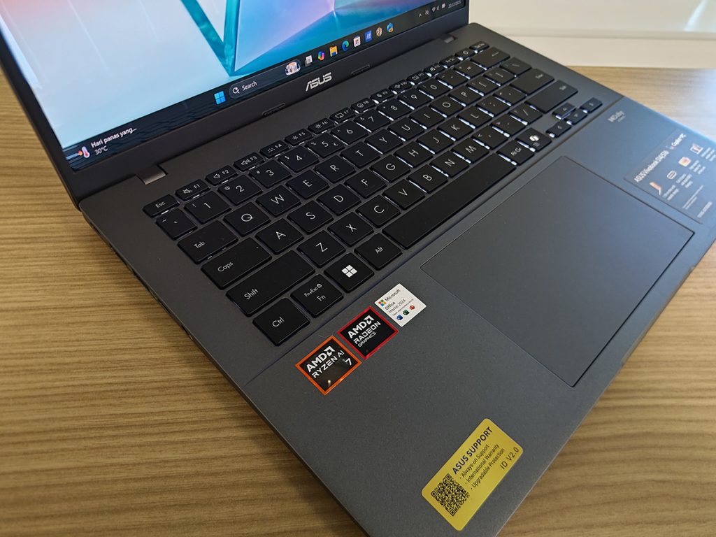 Keyboard chiclet berbacklight dengan tombol Copilot khusus di ASUS Vivobook S14 M3407KA menegaskan posisinya sebagai perangkat Windows 11 AI-ready. Touchpad presisi dengan gesture support membuat navigasi intuitif.