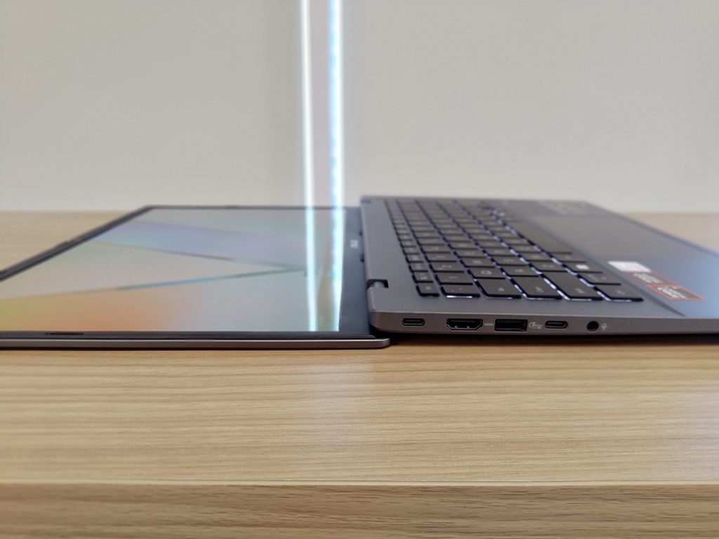 Desain tipis ini juga memaksimalkan rasio layar-ke-bodi hingga 87%, menciptakan tampilan modern dengan bezel tipis. Engsel kokoh dan stabil tanpa flex berlebihan menjadi bukti bahwa ASUS tidak mengorbankan kekuatan demi kesederhanaan desain.