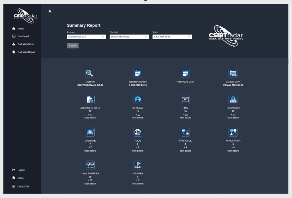 Di era digital yang penuh risiko, CSIRTradar hadir sebagai solusi proaktif untuk menjaga aset digital perusahaan. Dengan memantau kerentanan sistem dan aktivitas di Dark Web, organisasi dapat mencegah penyalahgunaan data, merencanakan strategi pertahanan, serta menjaga reputasi dan kepercayaan pelanggan.