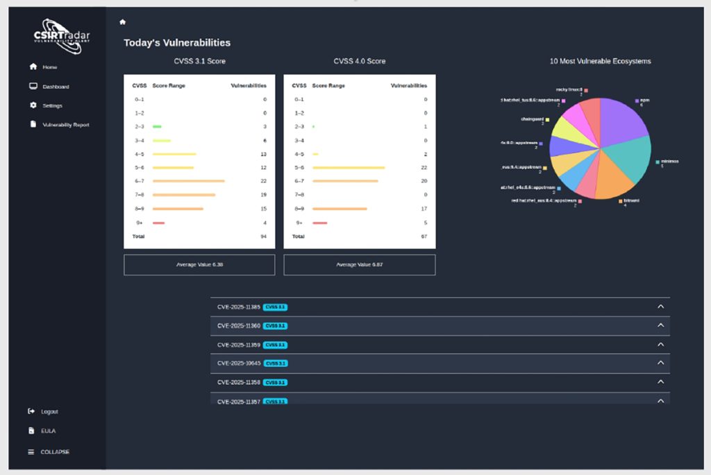 Platform ini memberikan peringatan dini atas celah keamanan terbaru berdasarkan CVE (Common Vulnerabilities and Exposures) dan OSV (Open Source Vulnerabilities). Notifikasi yang dihasilkan dikategorikan berdasarkan vendor, produk, tingkat keparahan (CVSS), serta rekomendasi prioritas penanganan. Integrasi melalui email dan webhook juga memudahkan tim keamanan menerima peringatan secara real-time dan mengotomatiskan alur respons.