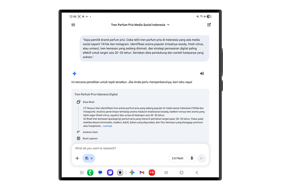 Contoh prompt Gemini Deep Research di Galaxy Z Fold7 yang digunakan pelaku usaha untuk melakukan riset pasar secara cepat dan komprehensif.