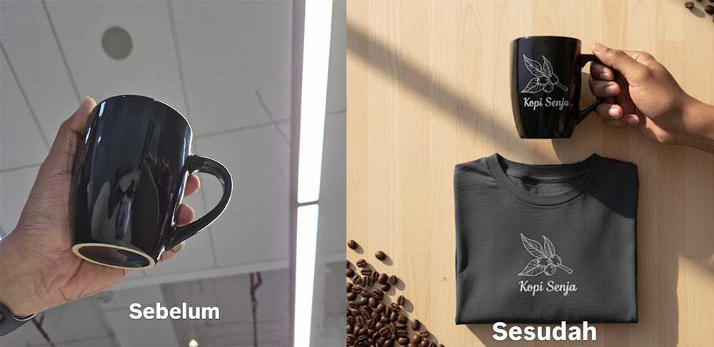 Selain itu, kamu bisa melanjutkan proses kreatif dengan prompt, “Sekarang, buatkan mock-up pada mug yang menampilkan logo tanaman kopi, lalu tambahkan kaos dan hias sekitarnya dengan ornamen estetik bertema kopi seperti biji kopi dan elemen kayu.” Dengan kamera utama 50MP menangkap warna dan tekstur asli dengan presisi, setiap hasil olahan AI terlihat natural dan profesional.