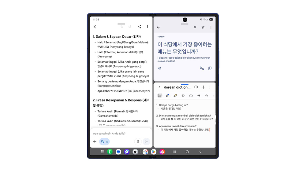 Semangat Hari Pahlawan juga bisa kamu salurkan dengan mencoba hal baru sambil terus berkembang. Lewat fitur Multi Window di Galaxy Z Fold7, kamu bisa mengeksplor berbagai hal dalam satu layar luas. Saat sedang belajar bahasa asing, kamu bisa membuka aplikasi pembelajaran, sambil di sisi lainnya mencatat kosa kata baru di Samsung Notes, dan menerjemahkan kalimat dengan aplikasi di sisi satunya. Semua bisa dilakukan dalam satu layar tanpa perlu berpindah aplikasi, memberikan ruang belajar yang benar-benar fungsional, bukan sekadar menampilkan banyak aplikasi di layar.