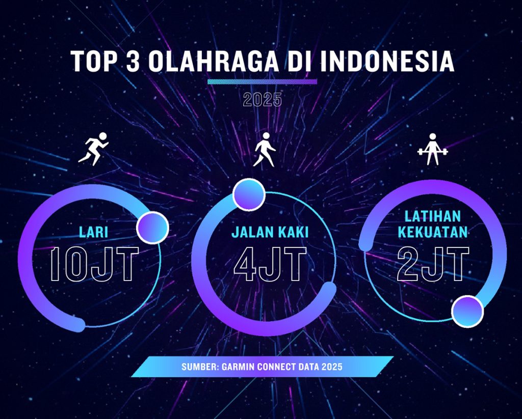 Berdasarkan data Garmin Connect, lari masih menjadi olahraga paling populer di Indonesia, dengan total aktivitas mencapai lebih dari 10,6 juta. Posisi berikutnya ditempati oleh jalan kaki dengan lebih dari 4,7 juta aktivitas, disusul latihan kekuatan yang terus menunjukkan tren peningkatan signifikan.