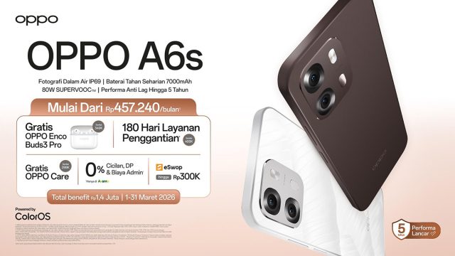 Selama periode promo 1–31 Maret 2026, konsumen juga berkesempatan mendapatkan berbagai keuntungan tambahan dengan total benefit hingga Rp1,4 juta. Beberapa di antaranya termasuk gratis OPPO Enco Buds3 Pro, layanan penggantian perangkat hingga 180 hari, serta OPPO Care.