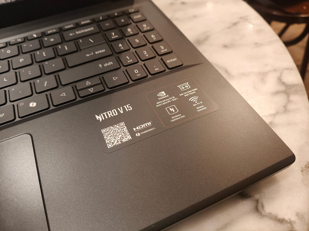 Bagian engsel cukup kokoh dan tetap stabil saat layar dibuka tanpa goyangan berarti. Permukaan palm rest terasa nyaman dan tidak mudah meninggalkan sidik jari yang berlebihan. Acer juga menambahkan backlit berwarna amber pada keyboard, memberikan sentuhan gaming yang keren namun tidak berlebihan. Secara keseluruhan, desain Acer Nitro V 15 bisa dibilang aman, maskulin, elegan, dan praktis. Ia tidak mencoba tampil paling futuristis, tetapi memberikan keseimbangan antara estetika dan fungsi.