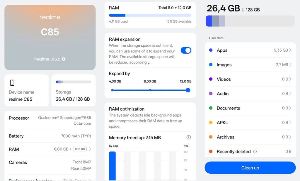 Di balik bodi tangguhnya, realme C85 diperkuat Snapdragon 685 6nm—salah satu chipset paling efisien di kelasnya—dengan opsi RAM dinamis hingga 24GB dan storage hingga 256GB. Kombinasi ini menjamin performa responsif untuk kebutuhan sehari-hari mulai dari multitasking, streaming, sosial media, navigasi, hingga gaming kasual.