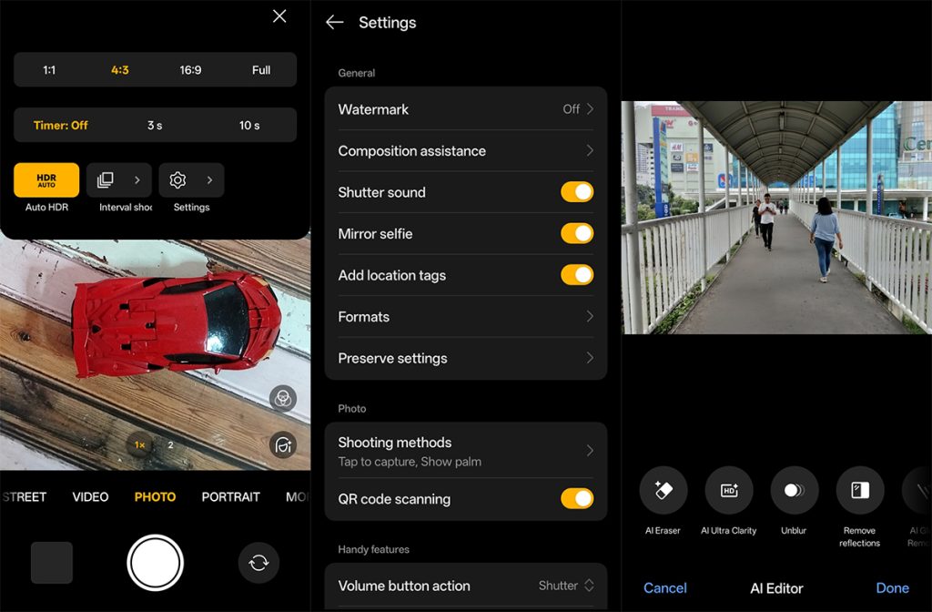 Aplikasi kameranya pun kini didukung fitur AI photography—AI Editing, AI LivePhoto, Portrait, Night Mode, hingga berbagai filter dan pengeditan instan. Namun, sebagai catatan, perekaman video untuk kamera depan dan belakang maksimal di 1080p 30fps, cukup untuk produksi konten media sosial. Tidak terdapat kamera ultrawide di model ini, namun bokeh digital tetap bisa dihasilkan dengan cukup natural.