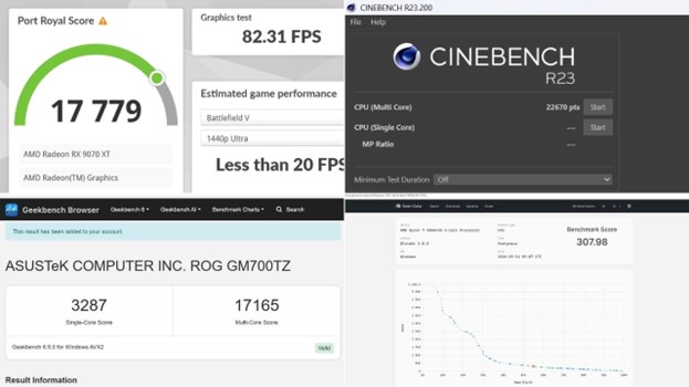 Jika melihat hasil benchmark sintetis, performa ROG GM700TZ menunjukkan konsistensi yang mengesankan di berbagai skenario. Dalam pengujian PCMark 10, skor yang diraih mencapai 10.769, yang menunjukkan bahwa desktop ini tidak hanya unggul untuk gaming, tetapi juga sangat mumpuni untuk produktivitas seperti editing video 4K dan multitasking berat.